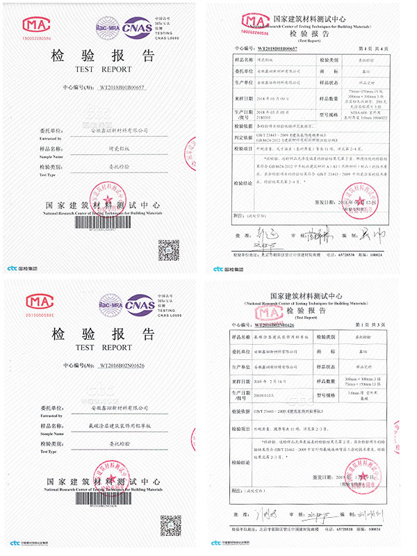 烤瓷鋁板的性能通過國家建筑材料質(zhì)量監(jiān)督檢驗中心檢測,按國家標準GB/T23443-2009《建筑裝飾用鋁單板》的標淮得出的數(shù)據(jù),所有的指標都是合格,特別其硬度達到6H以上。防火性能通過國家防火建筑材料質(zhì)量監(jiān)督檢驗中心檢測,按國家標準BB/T8624-2006《建筑材料及制品燃燒性能分級》的標準得出數(shù)據(jù),其防火性能A1級。